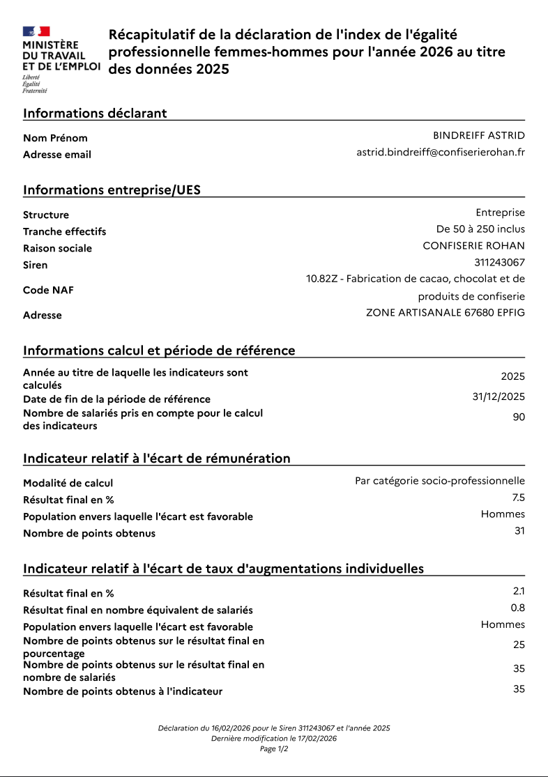 Index de l’égalité professionnelle entre les femmes et les hommes pour l’année 2026 au titre des données 2025
